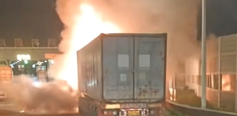 收费站出口一辆集卡突发起火事故所幸未有人员伤亡